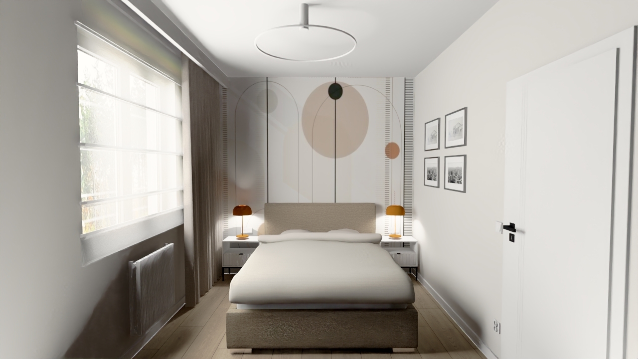 - Sypialnia w delikatnych, naturalnych odcieniach sprzyja wyciszeniu i regeneracji.