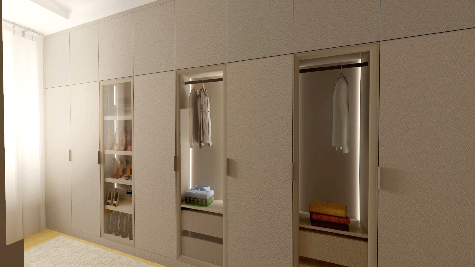 - Oświetlenie LED – podświetlane wnęki i lustro dodają wnętrzu elegancji i ułatwiają przeglądanie garderoby.