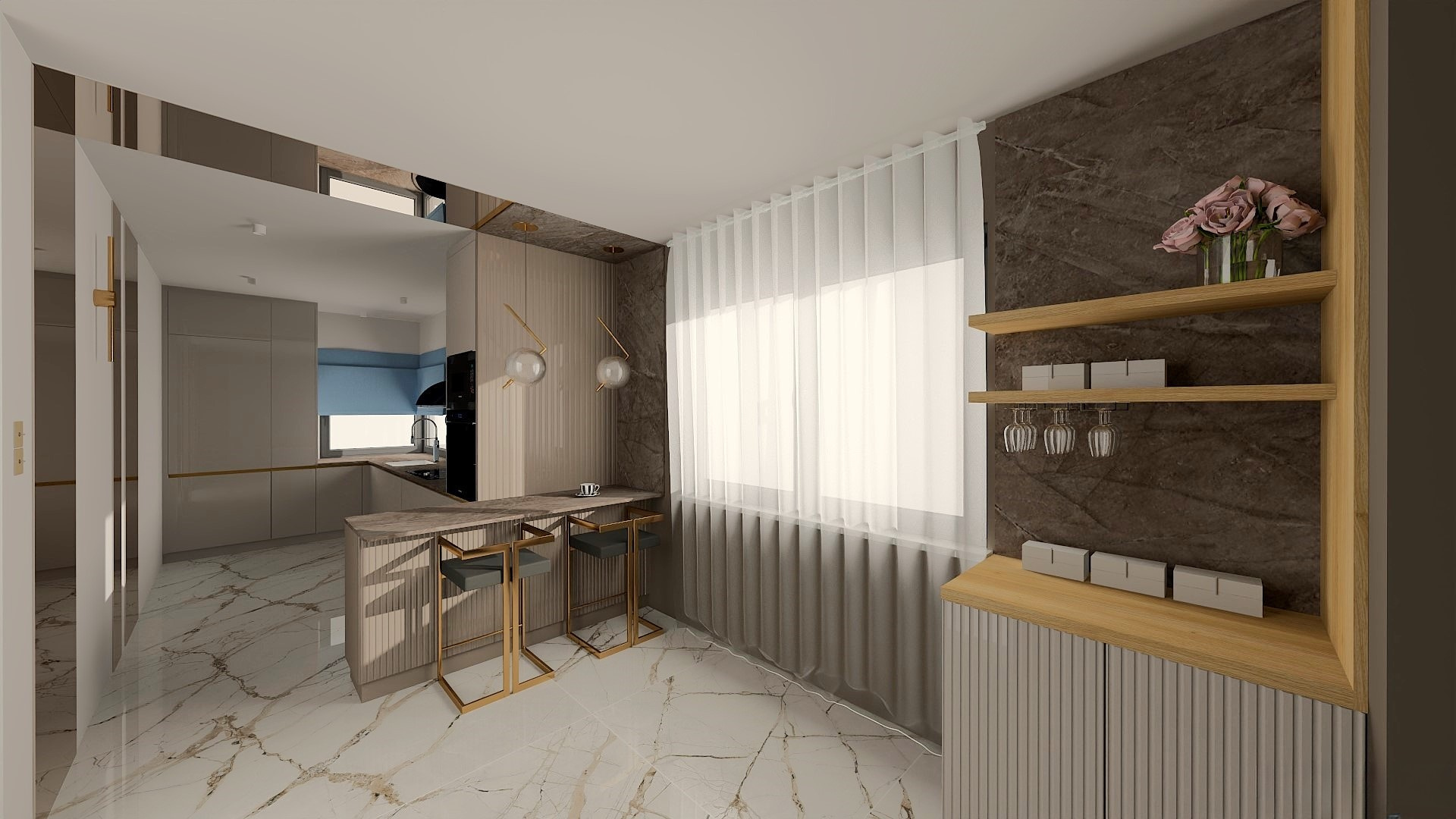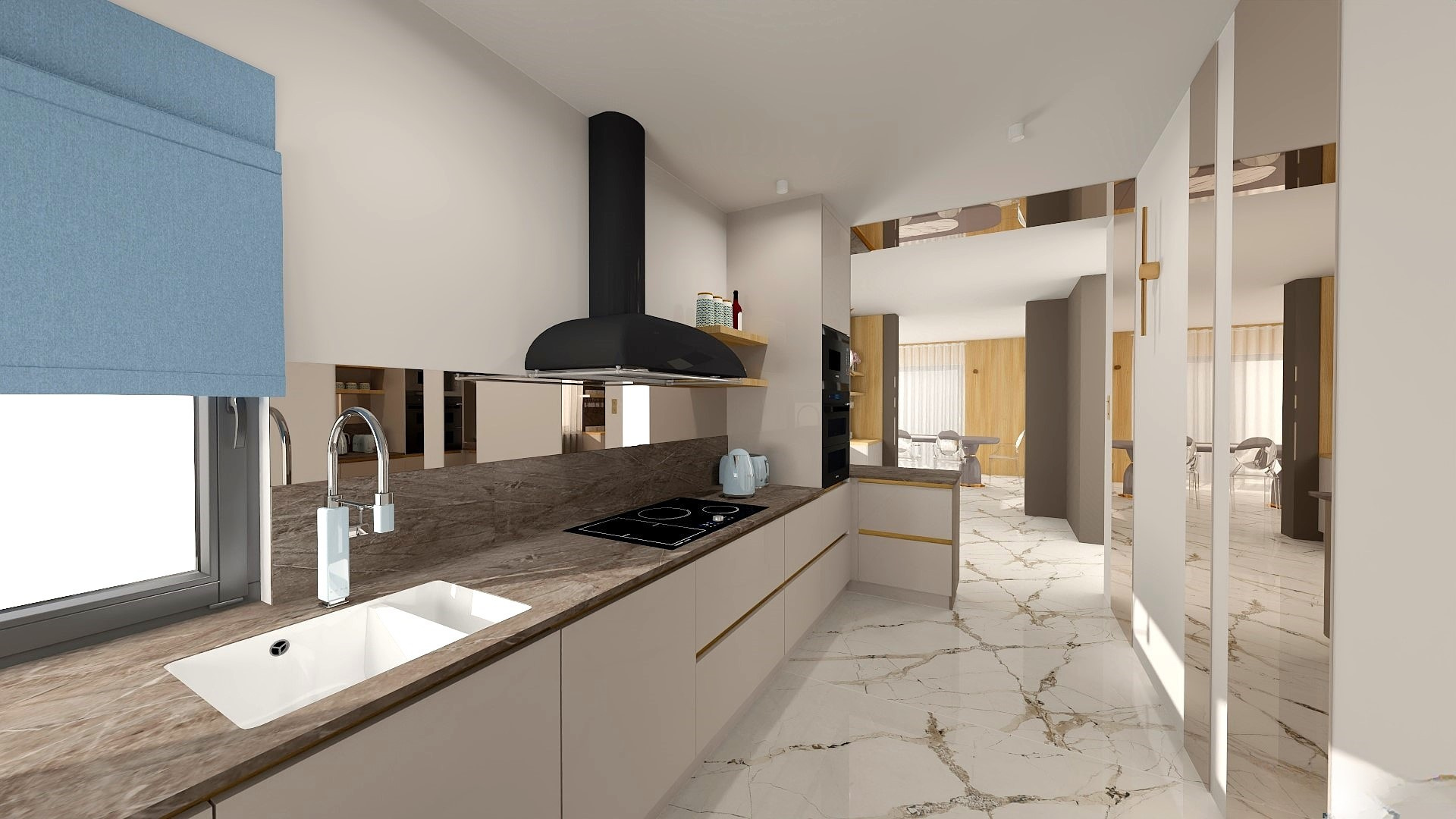 Ta kuchnia to połączenie minimalistycznego designu z nutą luksusu, który nadają złote uchwyty listwowe. Przemyślany projekt łączy estetykę z funkcjonalnością, tworząc przestrzeń, która zachwyca i inspiruje.