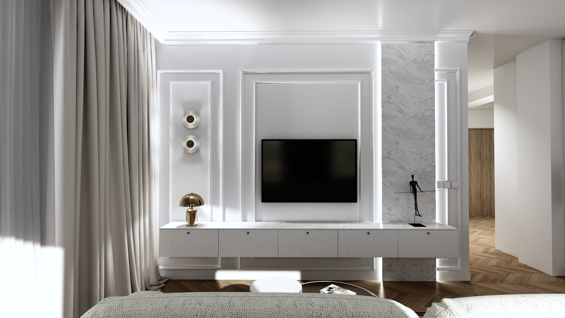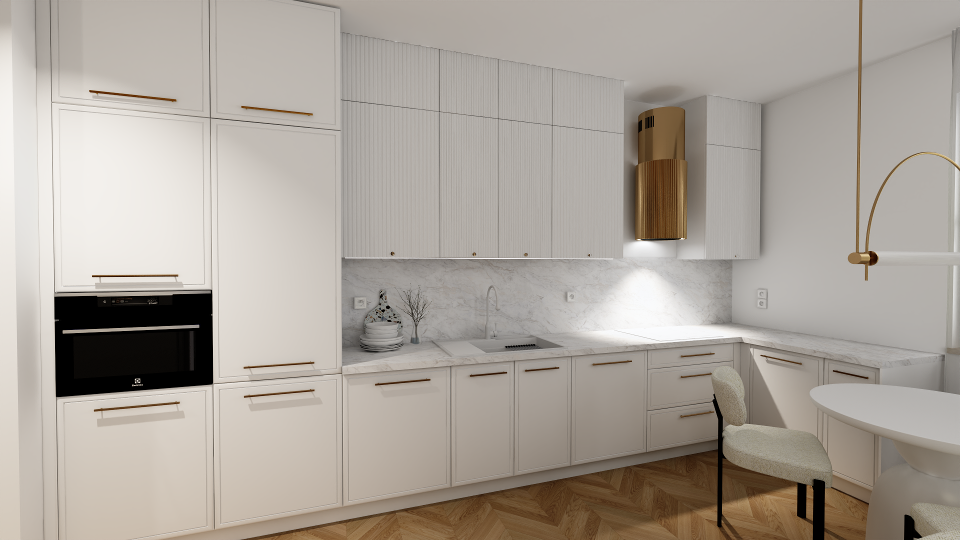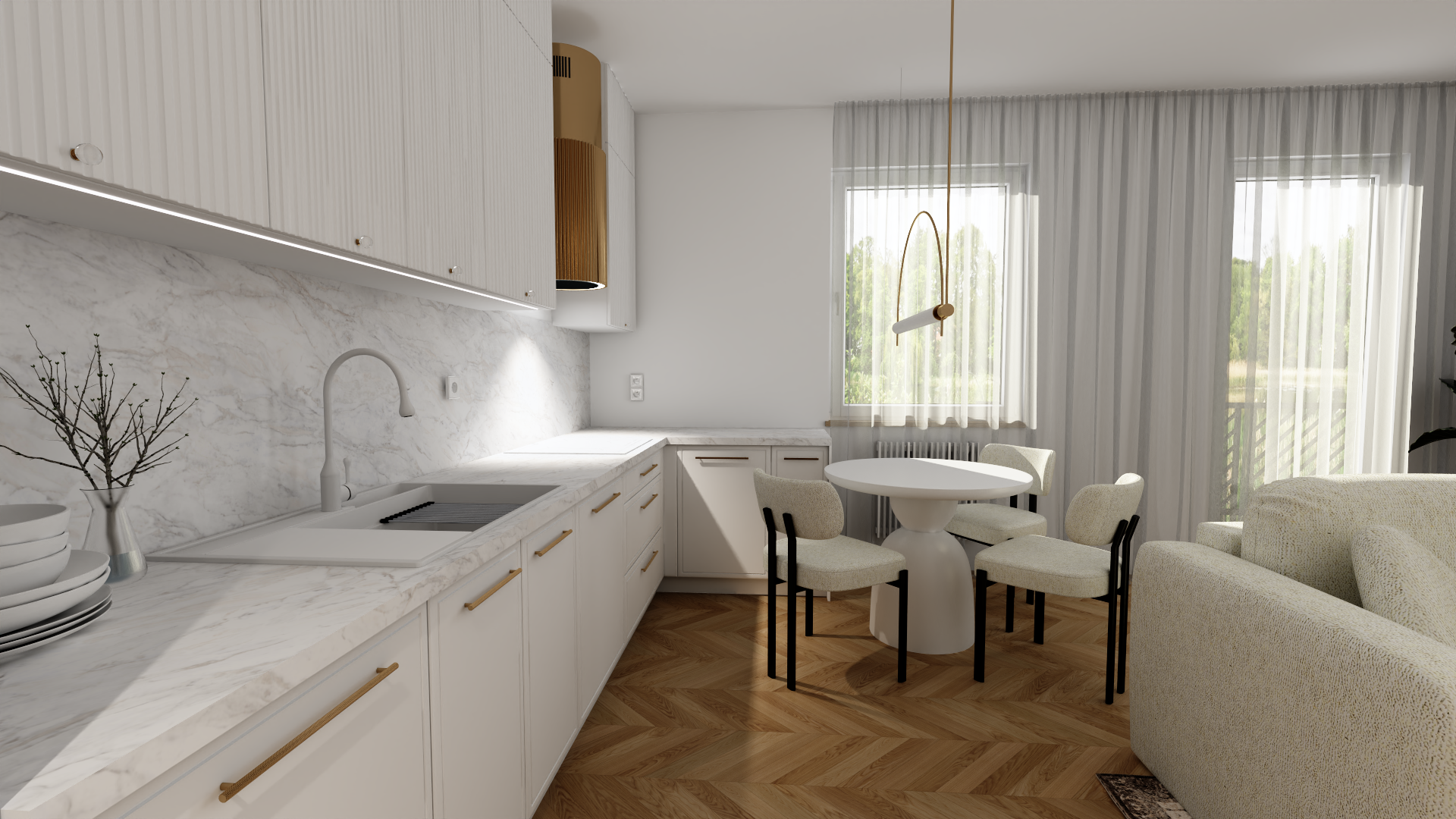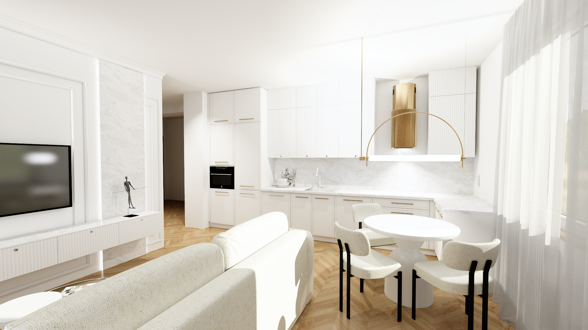 - Salon z aneksem kuchennym – przestrzeń dzienna łączy wygodną strefę wypoczynku z nowoczesną kuchnią. Wysokiej klasy zabudowa oraz przemyślane oświetlenie podkreślają minimalistyczny charakter wnętrza. Duże okna wpuszczają naturalne światło, potęgując wrażenie przestronności.