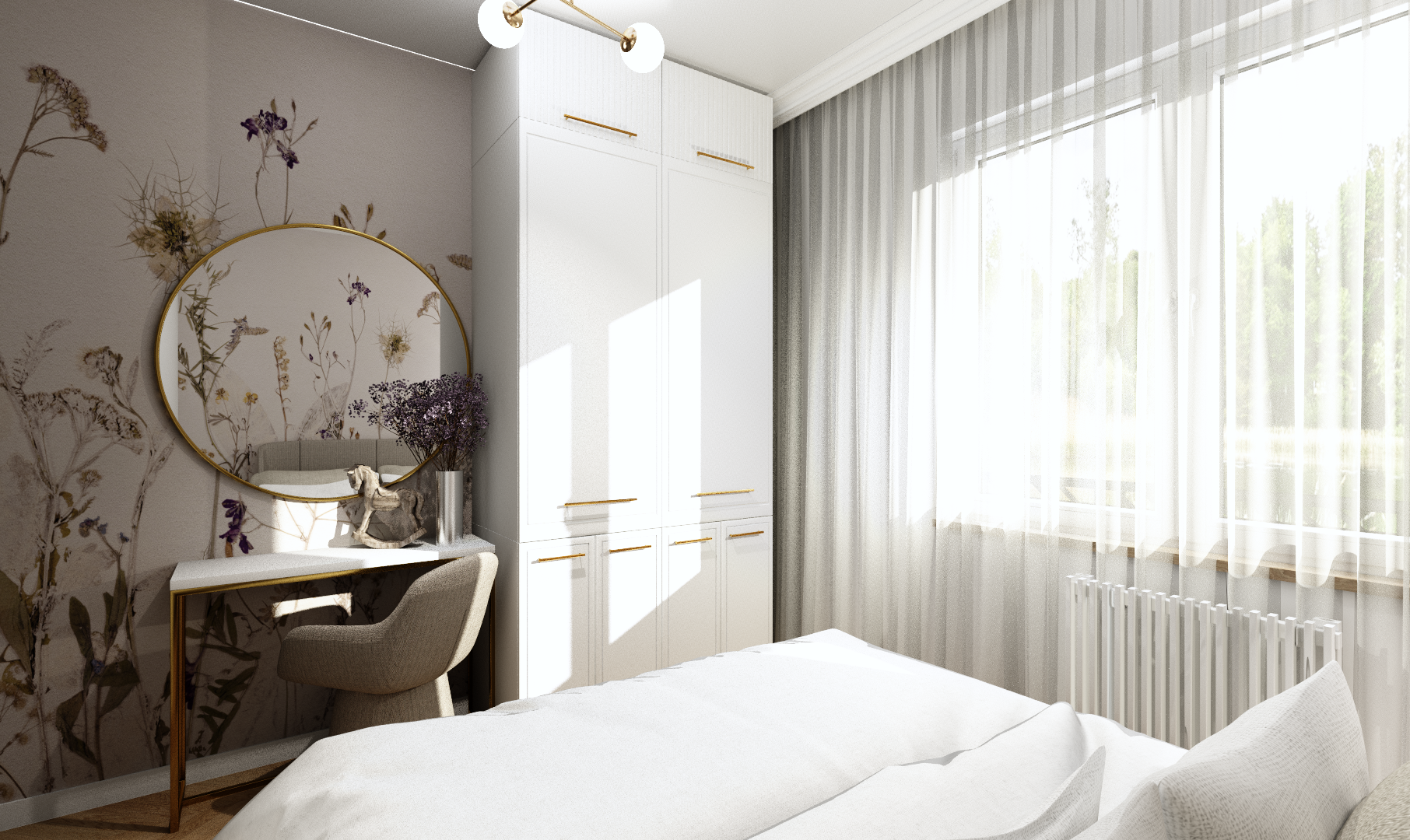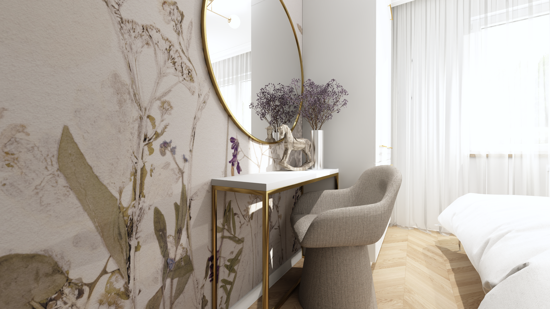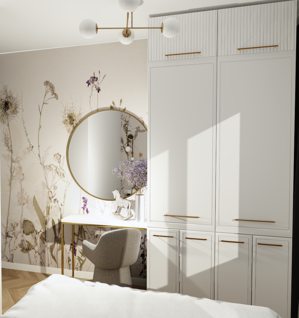 - Sypialnia – strefa relaksu, w której delikatne motywy roślinne oraz subtelne dodatki tworzą przytulny klimat.
