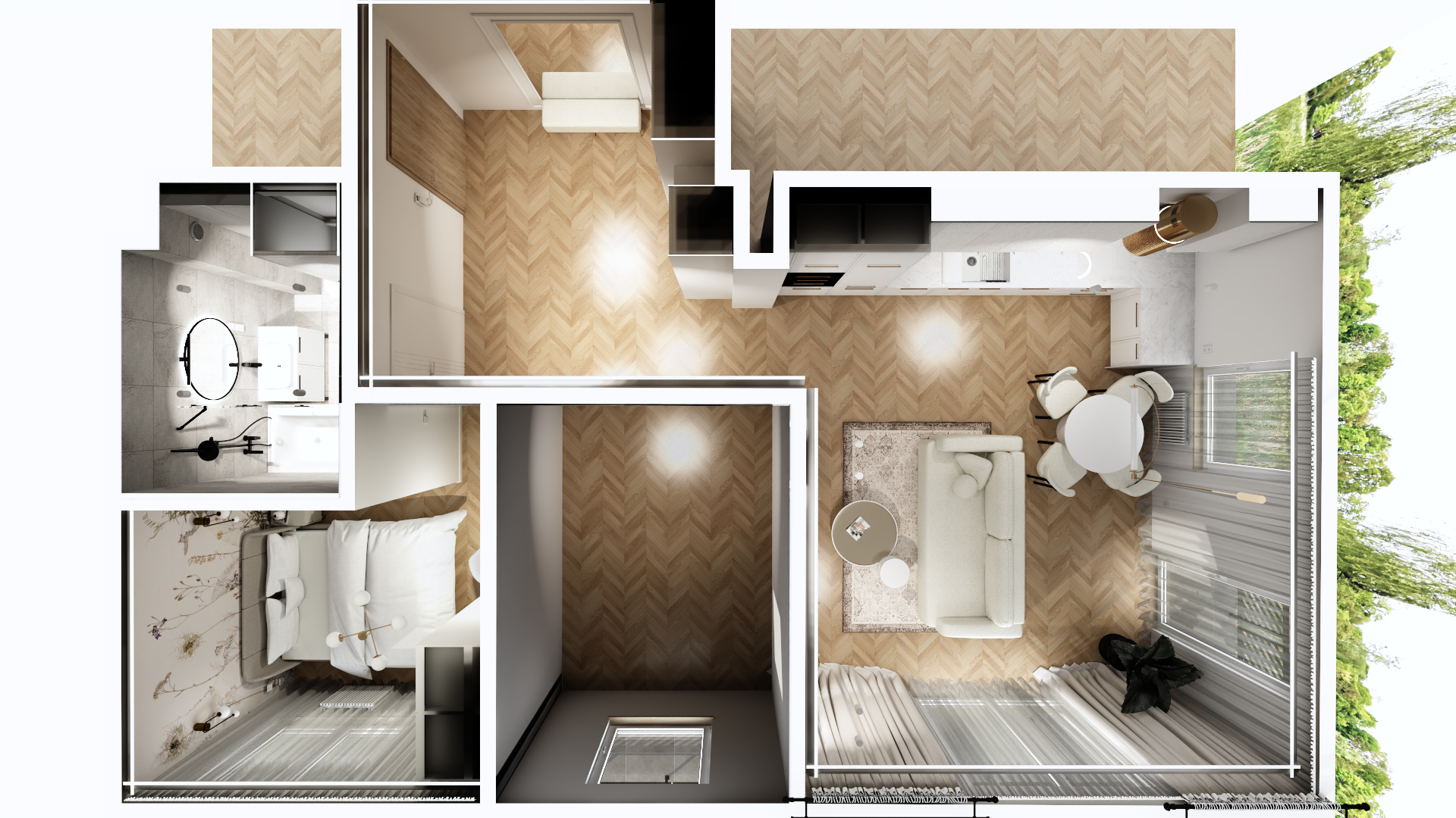 Drewniana podłoga w jodełkę, spójne dekoracje i naturalne akcenty sprawiają, że to mieszkanie jest idealne zarówno dla singla, jak i dla pary, poszukujących harmonijnego miejsca do życia.